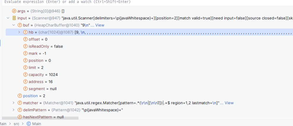 아래 디버그 스크린샷을 보면, next(), nextInt() 등으로 받으면 개행문자까지 버퍼에 들어간다.