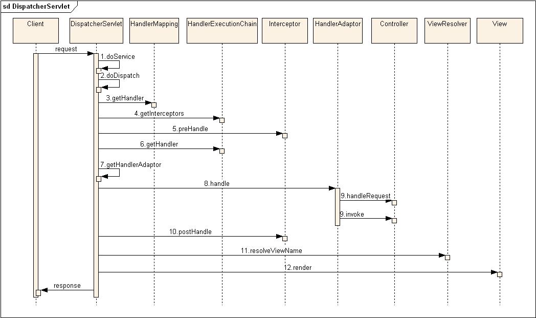 - 아래 3번~13번 작업이 doDispatch 메소드안에 있다. Controller, View 등의 컴포넌트들을 이용한 실제적인 웹요청처리가 이루어 진다.