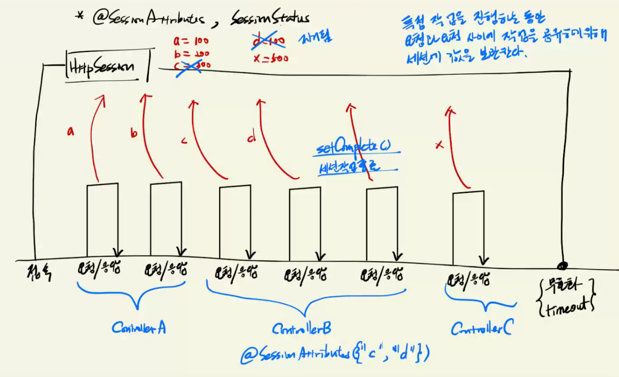 단 @SessionAttribute에서 명시된 값들은 세션에 없는 경우 에러를 띄운다. 파라미터에서도 꺼내지 않는다.
